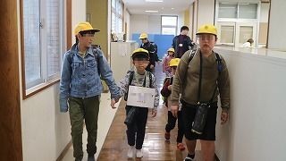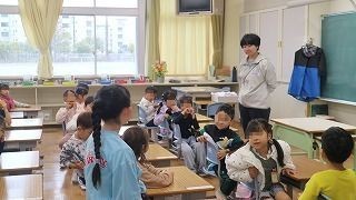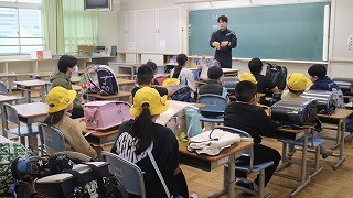 1年生を班長さんが迎えに来てくれます。通学団の教室では、集合場所の確認や通学路の様子、登校の様子などを話し合い、交通ルールを守って安全に登下校するための学習を行いました。下校は担当の先生と一緒に班で帰ります。先生も一緒に歩きながら登下校の様子を聞いたり、通学路の安全点検をしたりすることができました。