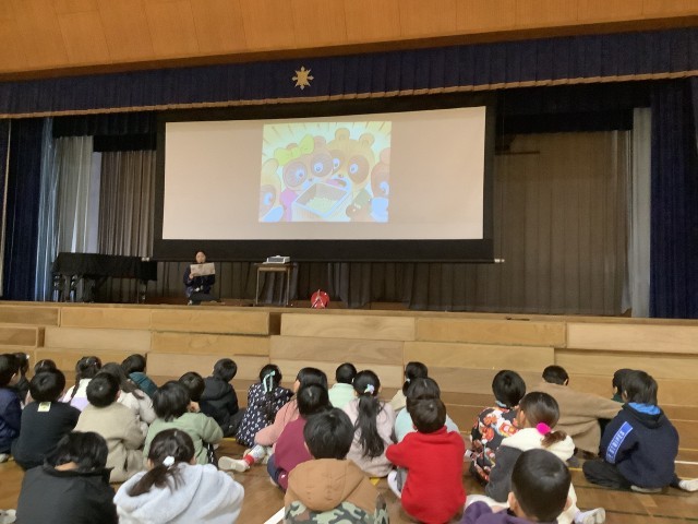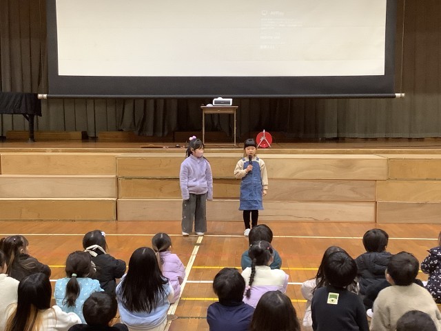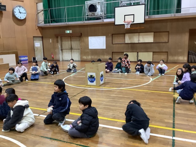 紙芝居「まめこぽりぽり おにはそと」を聞き、1年生の代表が心の鬼を発表し心の鬼を退治しました。