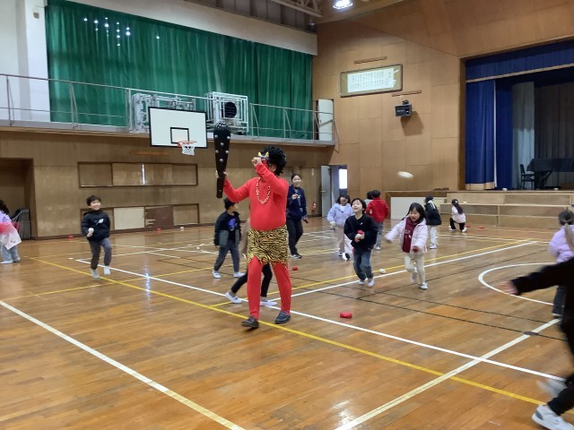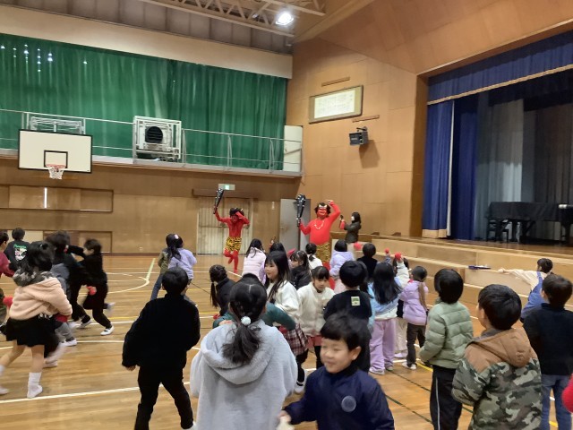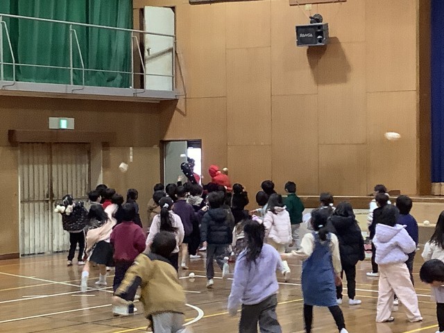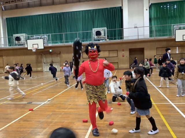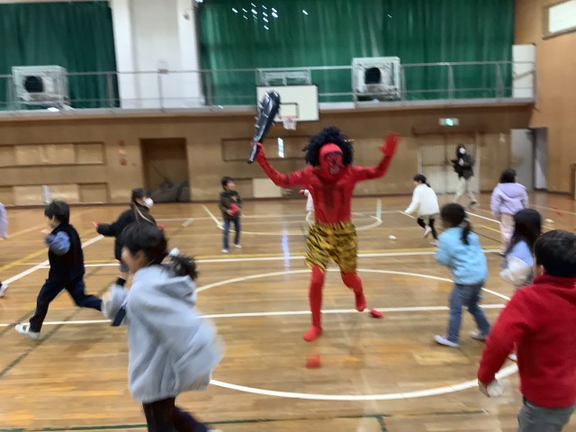 その後、体育館に2体の赤鬼が登場しましたが、1年生が勇敢に豆に見立てた赤白の玉で退治しました。