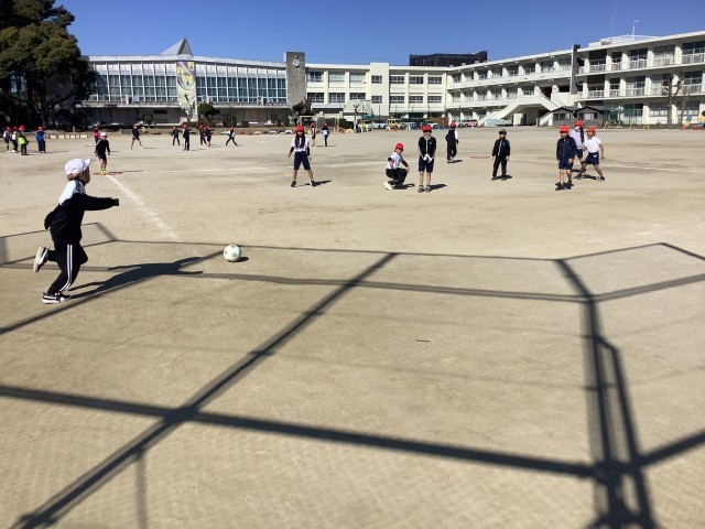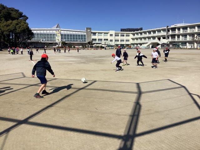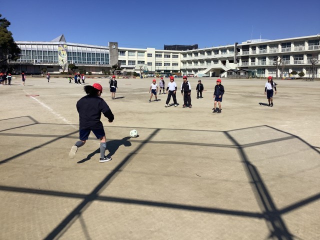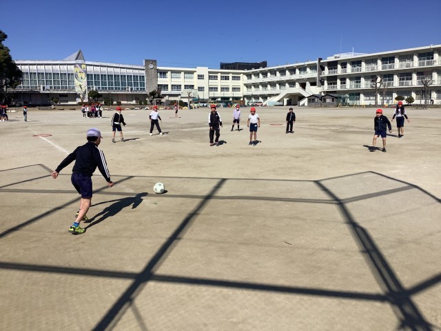 強く蹴って遠くに飛ばす児童や、相手のいないところを狙って蹴る児童もいて、それぞれが考えながら試合をしていました。