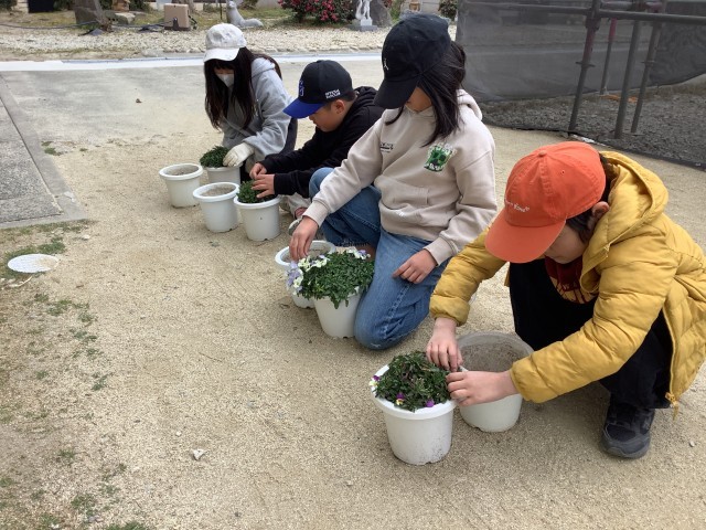 外そうじでは、卒業式に向けてパンジーやビオラの手入れをしています。
