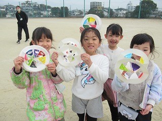 1年 生活科 公開日 2026/02/06 更新日 2026/02/06 1年 生活科の学習で、「風輪(かざわ)」を製作し、運動場で転がして遊びました。ノートで仰いだり、風向きを考えたりしながら、どうすればよく回るかを楽しみながら考えていました。
