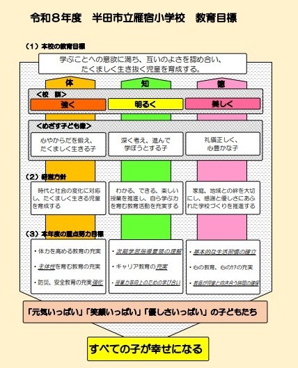令和8年度雁宿小学校の教育目標は、学校だよりでも概要を紹介しておりますが、改めてウェブページの配付物のページからもご覧いただけるように掲載しました。ご覧いただければ幸いです。(このページの添付ファイルからもご覧いただくことができます)