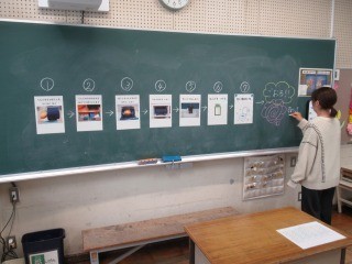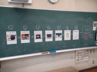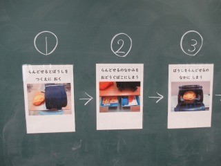 1年生の教室では、子どもたちの朝の準備の様子を、担任が写真のフローチャートで分かりやすく示していました。これで1年生の子どもたちも流れをよく理解できると思います。子どもたちが安心できるように、担任によるさまざまな視覚支援が工夫されています。