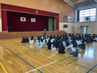 6年生は全クラスが体育館に集まり、学年の先生方からの話を聞いていました。