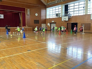 2年生体育 ボール蹴りゲームをやりました。パスされたボールを足でトラップできたら得点です。ゲームをするチーム、ボール拾いチーム、得点を数えるチーム、それぞれ自分たちの役割を果たしていました。