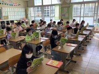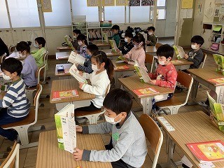 1年生国語 「ずうっと ずっと 大すきだよ」音読リレーをしました。今日は気持ちを込めて音読することがめあてです。登場人物の気持ちになって上手に読むことができていました。