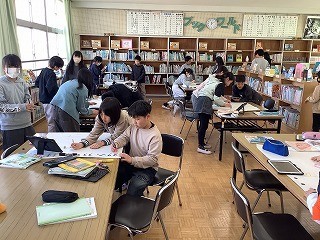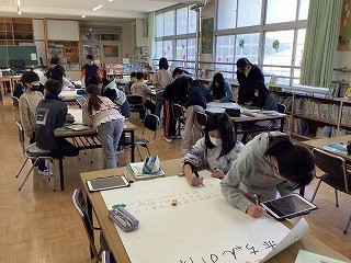 グループで模造紙に調べたことをまとめています。グループで協力して調べたことを構成したり、実際に書いたりします。以前はよくある光景ですが、最近は見かけなくなりました…