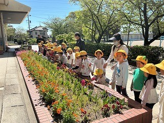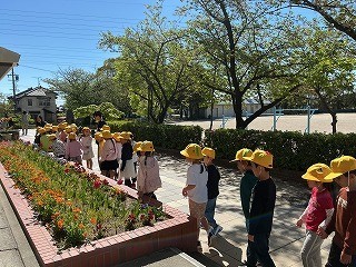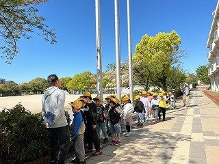 今日はとてもよい天気になりました。1年生は春の花を探しに校庭を散歩しました。