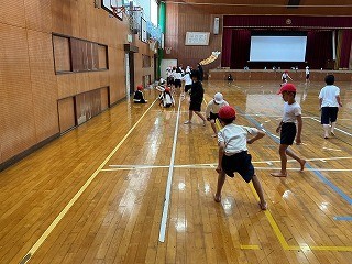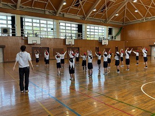体育館では、元気いっぱいの声で号令をかけて準備体操をしていました。心も体もしっかり準備をして実技に入ります。