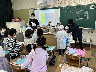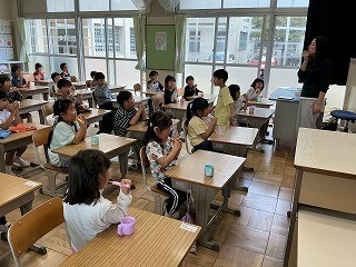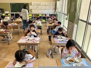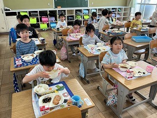 今日から給食が始まりました。準備、会食、片付け、歯磨きまでしっかりできました。