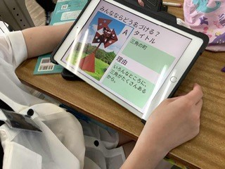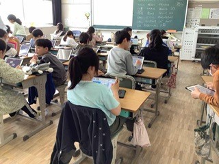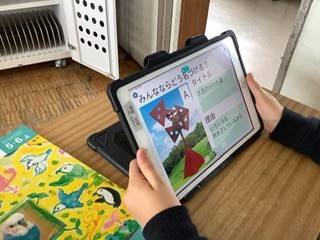 5年生 図工 自分で描いたり作ったりするのではなく、感じることの多様性を実感する学習をしていました。既成の作品を観て想像を巡らせます。みんながどう想像したか、タブレットで共有していました。