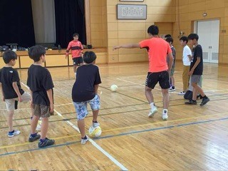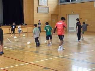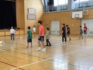 放課後 半田市スポーツ課主催のフットサル体験会が開かれました。放課後の子どもたち支援で半田市の催しです。今日から月曜日の放課後、8回開かれます。申し込んだ20名が集まってきました。プロの名古屋オーシャンズの選手が2名、コーチとしてきてくれます。学校とは一味違う練習で楽しい1時間でした。