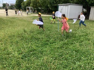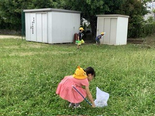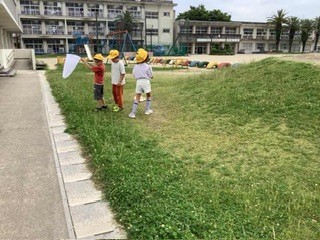 2年生 生活科で虫とりをしていました。たもを持って草の中を探していました。