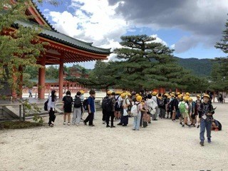 修学旅行 その8 公開日 2025/10/01 更新日 2026/02/19 乙東っ子日記 京都はタクシーを使った分散研修。MKタクシーさんの朝会を体験させていただきました。それぞれの研修を終えて、平安神宮でお世話になったタクシーの運転士さんにお礼とさようならをしました。予定通り、みんな元気に京都を出発しました。