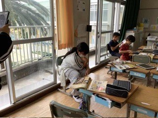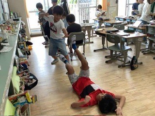 4年生 図工 面白い名画等の鑑賞をしていました。絵で描かれた人や彫塑の人の動きを真似をしていました。名作品の躍動感を体感していました。