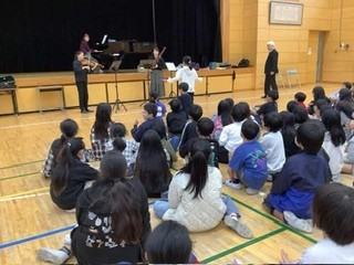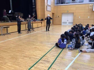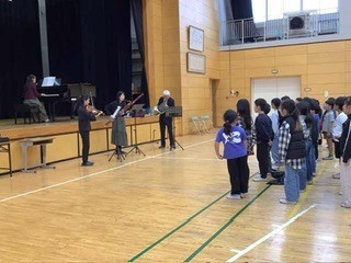 4年生 市の事業で、プロの音楽家の演奏を間近で聞く会がありました。ファゴット・ホルン・バイオリン・ピアノの演奏です。金管楽器や木管楽器の音の出る仕組みを教えていただき、身近なストローやホースでも曲を奏でることができることがわかり、感嘆の声が上がっていました。