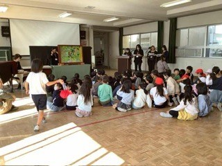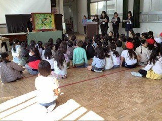 大放課 おはなし会のみなさんに大型紙芝居をしていただきました。放課なので、聞きたい子が集まってきます。いろんな効果音もあって楽しかったです。
