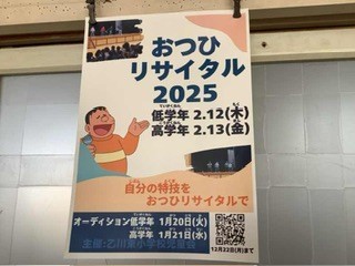 今日の乙東っ子 おつひリサイタル オーディション 公開日 2026/01/19 更新日 2026/02/26 乙東っ子日記 毎年恒例のおつひリサイタルのオーディション(高学年) が、大放課に開かれました。主催の総務委員会の児童が、オーディションに参加した児童の動画を撮っていました。ダンス、楽器、ルービックキューブ、、、自分の得意を披露する姿は素敵です。本番のおつひリサイタルが楽しみです。 +1