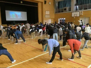 今日の乙東っ子 ぽかぽか体操ウィーク 公開日 2026/01/21 更新日 2026/02/26 乙東っ子日記 運動に親しむように、体育委員会の企画でぽかぽか体操ウィークが開かれています。学年ごとに指定日の昼放課に体育館でみんなでラジオ体操を行う企画です。自由参加ですが、大勢の子どもたちが集まってラジオ体操をしていました。 +1