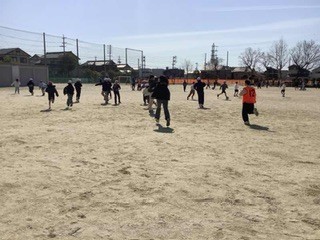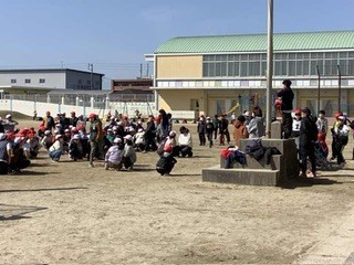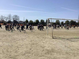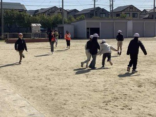 今日は、卒業を前に、6年生が3、4年生とけいどろで遊びました。6年生が警察になって追いかけます。運動場を全面使って思いっきり遊びました。