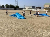 1年生 体育 風でいろんな形に膨らむブルーシートを跳び越していました。臨機応変に...