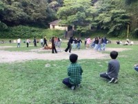 2組は野外活動思い出ハンカチ落としゲーム。オニになると、野外活動の思い出を話しま...