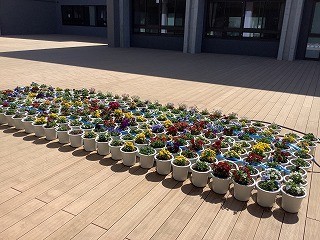 卒業式会場を彩るパンジーも美しい花を咲かせいまかいまかと準備をしています。