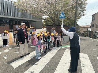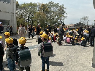 4月9日 1年生下校の様子 公開日 2026/04/10 更新日 2026/04/10 学校のようす 9日の下校の様子です。職員に加え、かめっ子応援隊の方が3名で下校しました。色別に並び、人数が確認できたら出発です。交通指導員さんも来てくださいました。