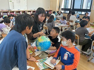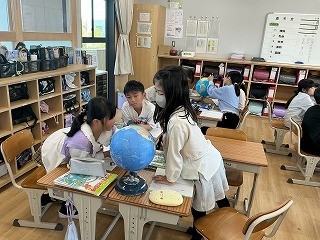 ◇5年生 社会 地球儀の見方を学びました。西経〇度を見つけたり、国を探したりしました。