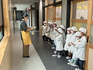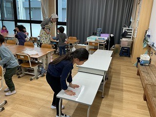 みんなで手洗いを済ませます。その後当番は白衣を着て、机をふく係の人は配膳台とお友達の机を水拭きします。