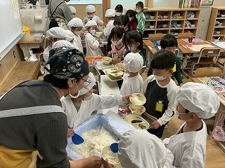 お配りの係の人たちも上手に机の上に食器を置くことができます。