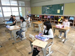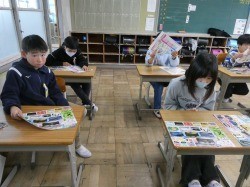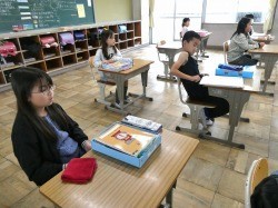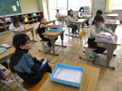 4年生は、教科書などを机の中にしまう際の整頓の仕方を確認しました。5年生は、裁縫道具の申し込みの封筒を配付していました。
