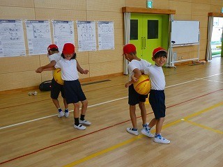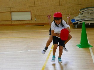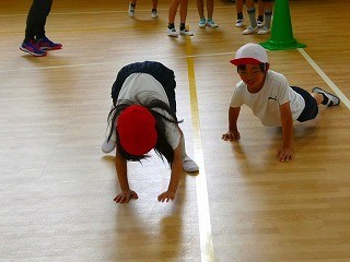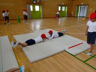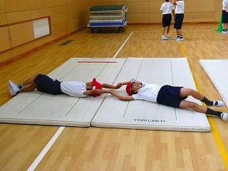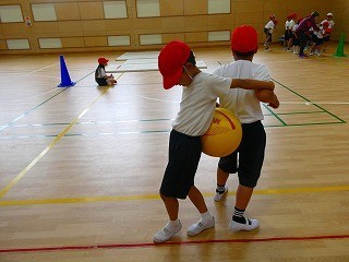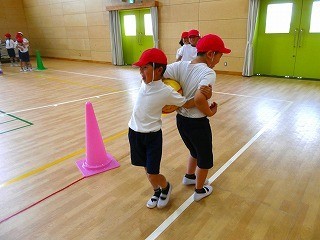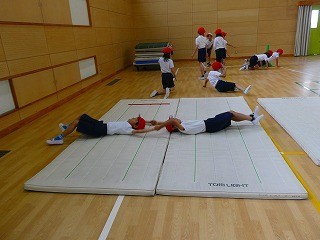 体育科の授業で、体つくり運動を行いました。マットの上を友達と手をつないで転がったり、ボールを背中に挟んで歩いたりしました。とても楽しそうでした。