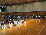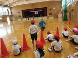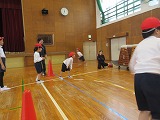 「リズムかけっこ」太鼓のリズムに合わせて歩いたり、走ったりします。太鼓の音をよく聞き分けて、動作をかえることができました。