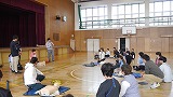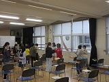 授業中に暴風警報が出たという想定で、避難訓練をしました。体育館に通学分団ごとに整列します。全校児童が一斉に集まるので、時間はかかります。実際に警報が出た場合は、素早く静かに集まって、雨がひどくなるまでに帰れるように、訓練をしました。