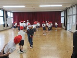 雨で運動場が使えなかったので、多目的ルームで体を動かすじゃんけんゲームをしました。
