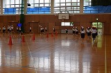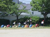 カラーコーンの周りを駆け足で回っている間に、先生がお手玉の色を言います。その色のお手玉をすばやく取ります。最初はみんな取ることができるですが、お手玉の数が減り、だんだんと取れなくなってきます。