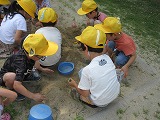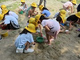 砂場でカップやバケツ、ペットボトルを使って水と土で遊びました。