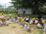1年生は、あさがおに水かけをしていました。芽が出てきています。