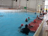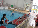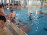 6年生は着衣泳をしました。「泳ぎにくかった」「ビニール袋よりペットボトルの方が泳ぎやすかった」など、体験して初めて気づくことがありました。