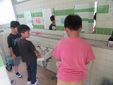 給食前の手洗いは、とても丁寧にしていました。きれいな手で給食の準備を進めます。
