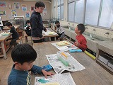教育実習生も児童の間を回って声かけをします。担任と二人体制です。