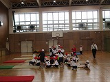 朝の時間に、応援の練習をしています。6年生が他学年に教えにいっています。