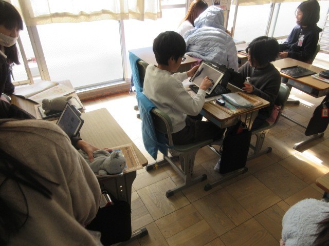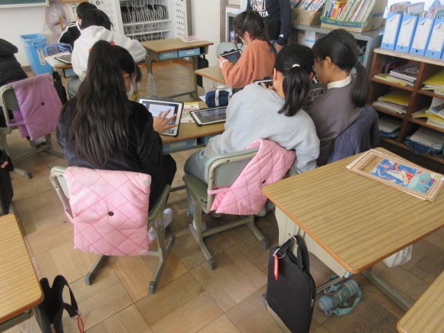<5年生> 外国語活動では、自分たちが日本で行きたいところを英語で紹介するプレゼンテーションを作成しています。完成したらポール先生に紹介します。