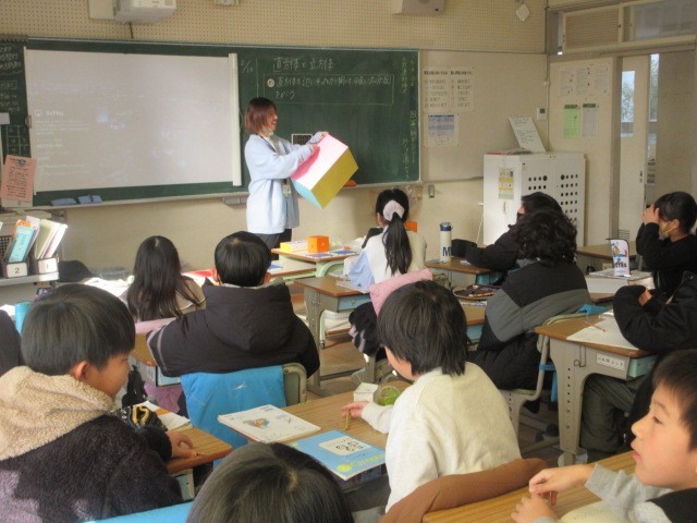 算数「直方体と立方体」では、直方体の展開図の書きました。箱を辺に沿って切り開いて、平面になった状態にしてどのような形になったかを確認しました。