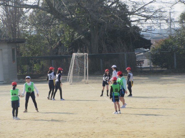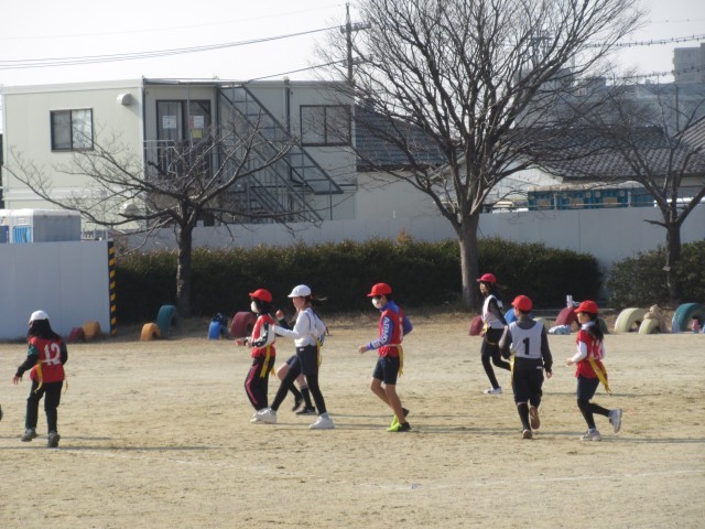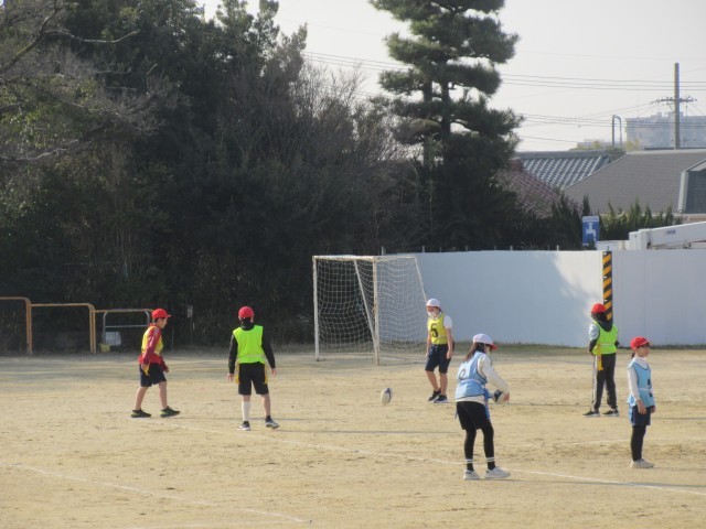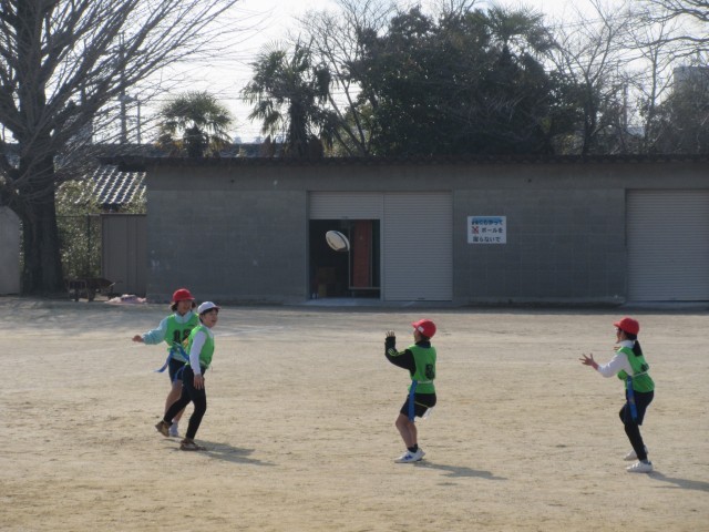 体育ではタグラグビーです。ラグビーとちがって接触はなく、腰に巻いてあるタグを取ります。