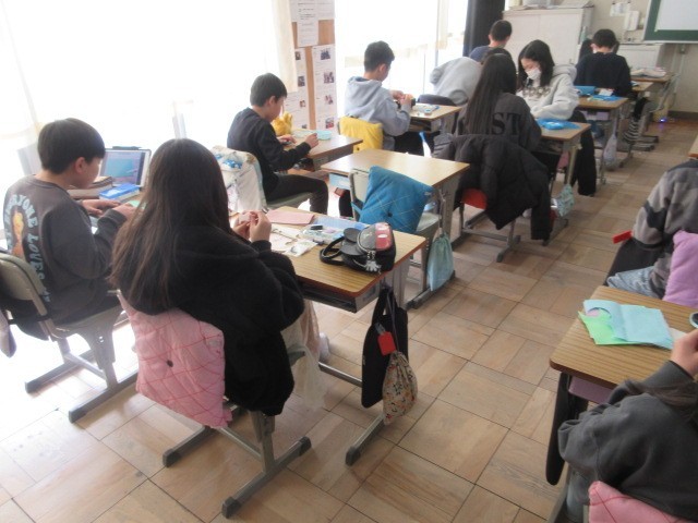 家庭科「思いがこもった贈り物をつくろう」では、フェルトにチャコペンで思い思いのキャラクターなどを描き、上手に縫っていました。