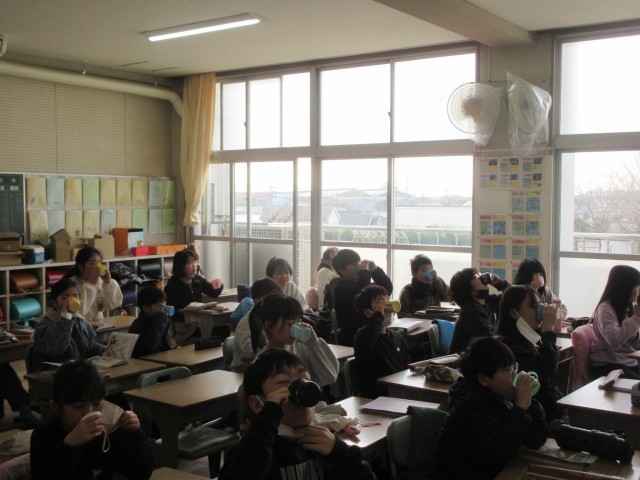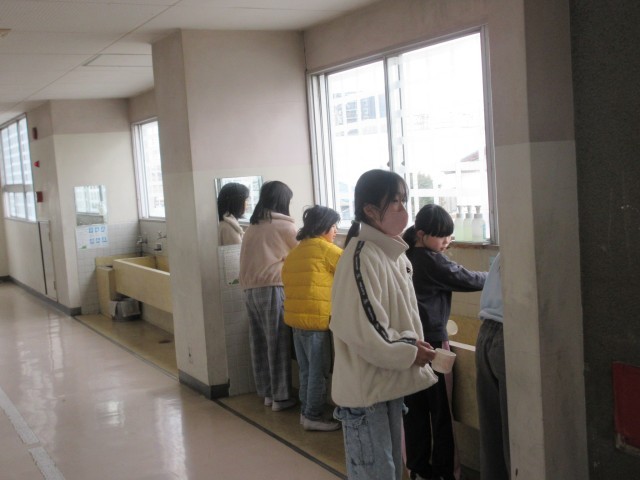 フッ化物洗口 公開日 2026/03/06 更新日 2026/03/06 学校生活のようす 4年生と2年生のフッ化物洗口の様子です。5年生は、コップを洗っているところでした。歯の健康は大切です。食後の歯みがきも丁寧にがんばろう。 +4