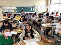 5年2組です。算数の授業「小数✖️小数の計算の仕方を考えよう」に取り組んでいました。「積の小数点の位置に目を付けて、0がいるかどうかを考えると分かりやすいとのことでした。